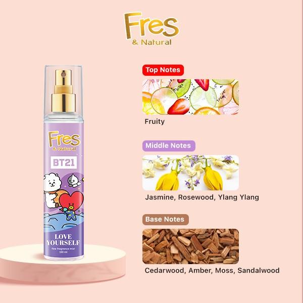 Produk Fresh & Natural Love Yourself (dari koleksi BT21) adalah parfum (cologne) dengan aroma buah dan bunga yang memberikan kesan misterius, sensual, gorgeous, dan elegan. Parfum ini memiliki aroma yang tahan lama, tidak meninggalkan noda pada pakaian, dan dikemas dalam botol yang elegan serta praktis untuk dibawa bepergian